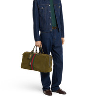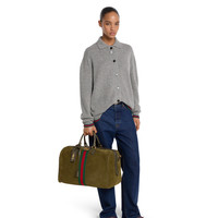 In the Fall Winter 2025 collection, the Gucci Savoy pairs suede with leather trims, combining texture and depth. Accented with the House’s signature Web and Double G detail, this duffle silhouette reflects timeless elegance through refined materials. - Dark green lightweight soft suede - Gold-toned hardware - Web detail - Cotton linen lining - Double G - Capacity: 28L - Inside: 1 zip pocket - Outside: detachable Liftboy ID tag, 1 lock and 1 key holder - Handle drop: 4.7" - Detachable and adjustable leather shoulder strap with 46.8" - 52.7" drop - Zip closure - 17.3"W x 11.4"H x 9.8"D - Weight: 5lbs, approximately - Made in Italy