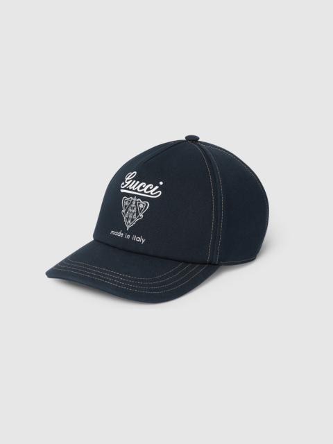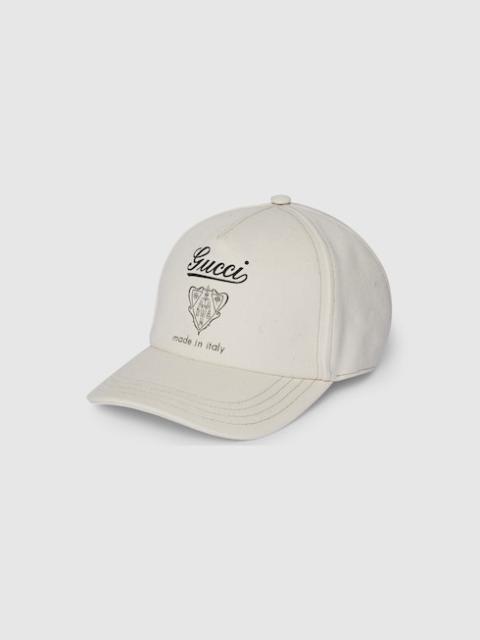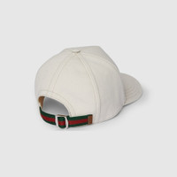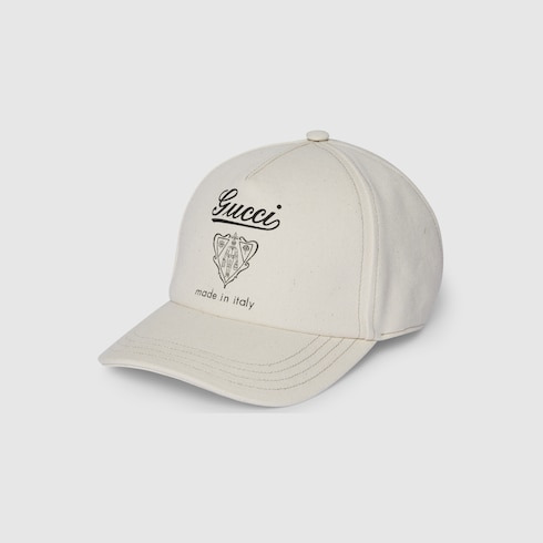 In the Spring Summer 2025 collection, a selection of soft accessories features historic symbols of the House, adding a logo touch. Crafted from white cotton canvas, this baseball hat is defined by a Gucci Crest print on the front. An adjustable back closure with Web completes the accessory. - White cotton canvas - Gucci Crest print - Unlined - Adjustable back closure with Web - Made in Italy