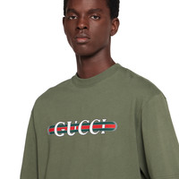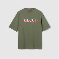 Pre-Fall 2025 pieces in muted black, grey and green tones spotlight delicate floral embroideries, embossed logos, and more craftsmanship details.Crafted from forest green heavy cotton jersey, this T-shirt is defined by Gucci Web print. - Forest green heavy cotton jersey - Gucci Web print - Crewneck - Short sleeves - Oversize fit - Length: 29.9"; Shoulder: 21.3"; Chest: 24"; Sleeves length: 11"; based on a size M - Made in Italy