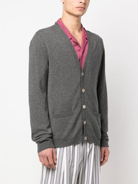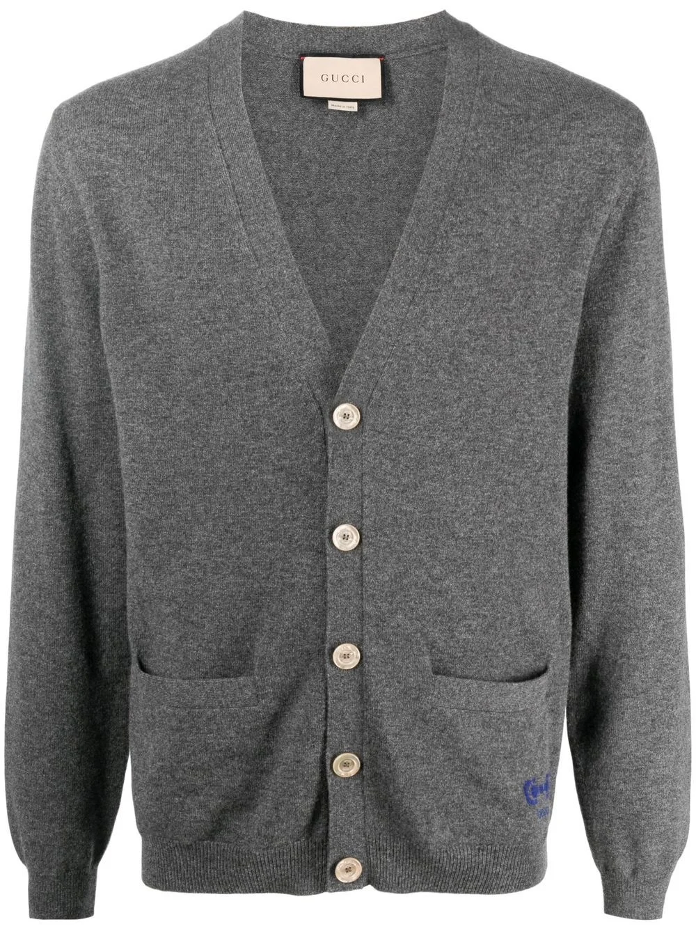 Horsebit-detail cashmere cardigan charcoal grey/royal blue cashmere marl knit signature Horsebit detail embroidered logo to the side ribbed edge front button fastening V-neck two front pouch pockets long sleeves straight hem Made in Italy Composition Cashmere 100%, Polyester 100% SIZE & FIT Model measurements Height 6 ft 1 in(1.85 m) Bust/Chest 35.82 in(91 cm) Hips 37.79 in(96 cm) Waist 29.13 in(74 cm) FittingInformation This piece fits true to size. We recommend you get your regular size Cut for a slim fit Made with a mid-weight fabric