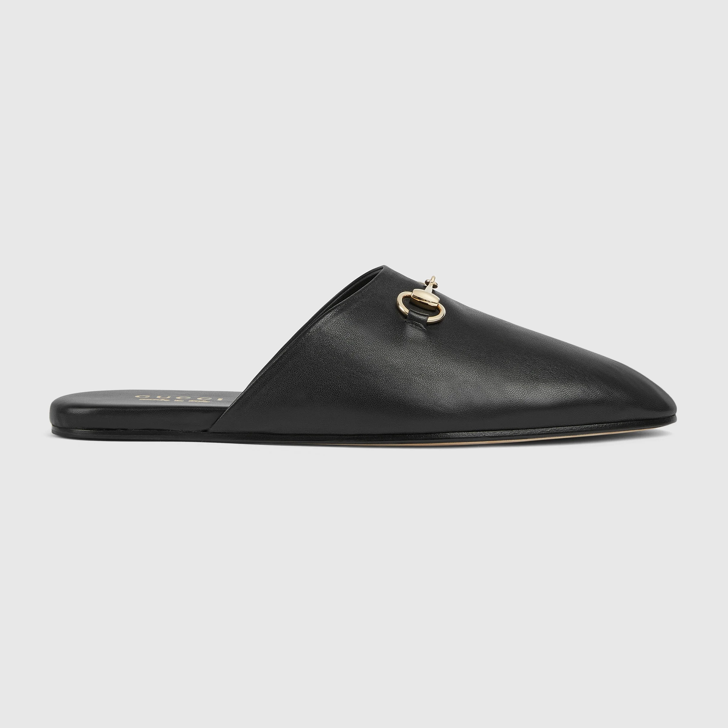 In the Fall Winter 2025 collection, Gucci continues to feature archival symbols. For the latest collection, the Horsebit hardware recalls the House's equestrian heritage. This pair of men's mule is crafted in supple leather and defined by a light gold-toned hardware. - Black leather - Light gold-toned hardware - Horsebit - Leather sole - Flat