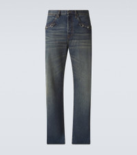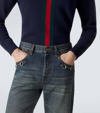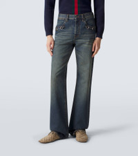 An unwavering commitment to craftsmanship and heritage sets Gucci apart. Part of La Famiglia collection, these jeans are made from washed cotton denim and come in a slightly flared silhouette with Horsebit detailing at the pockets. Product Details - Material: 100% cotton - Care instructions: dry clean - Made in Italy - Color: blue - Designer color name: Blue - Lining: 65% polyester, 35% cotton - Insert: 100% calf leather - Contains non-textile parts of animal origin - Closure: zipper fly, button fastening - Belt loops - Pockets: five pockets - Item number: P01151297 Size & Fit - Fits small to size - we recommend trying two sizes larger - Non-stretchy fabric - Wide-leg - Mid-rise - The model in the picture is 185cm-6'1" and wearing a size 34
