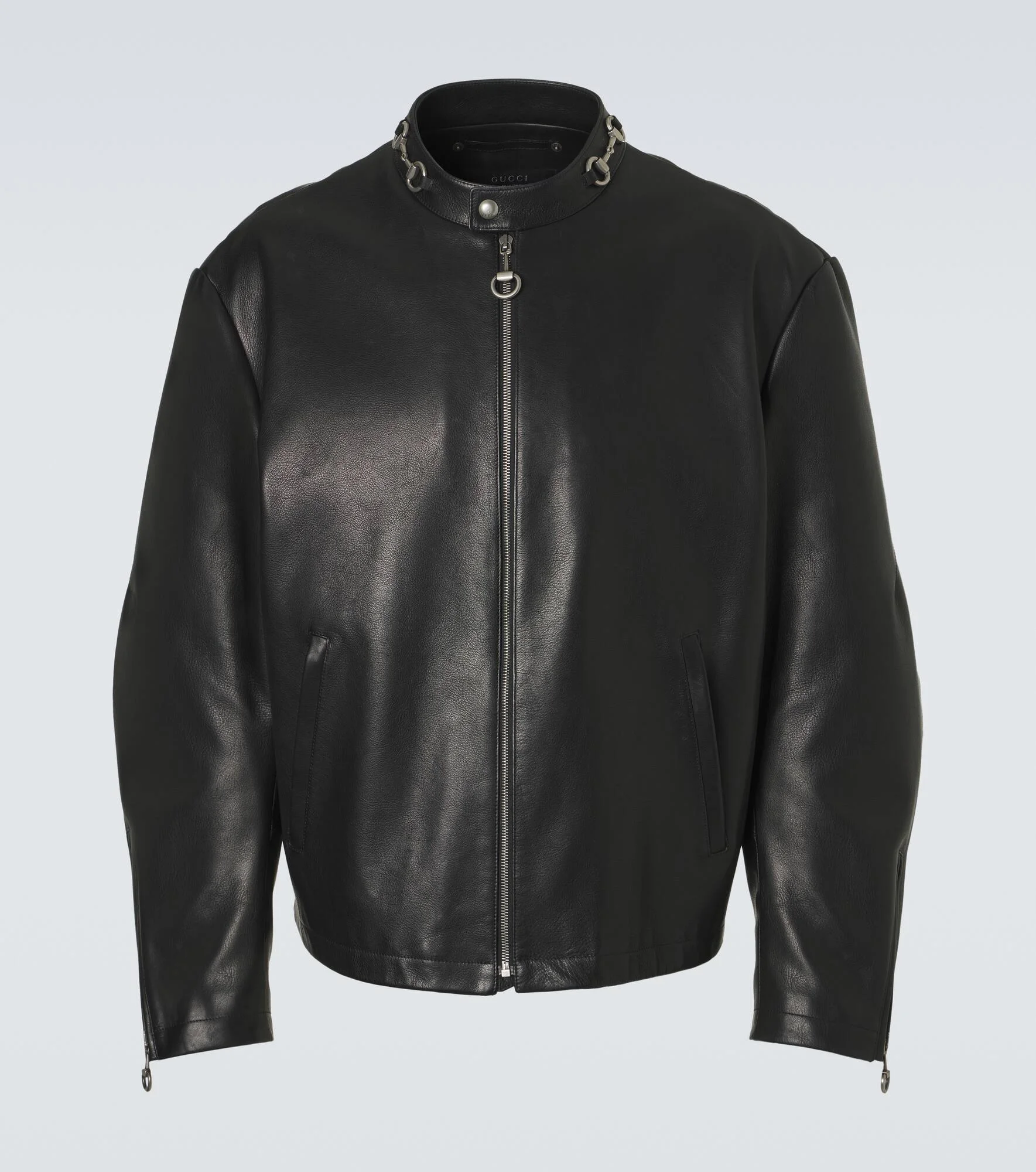 Part of La Famiglia collection, this jacket is Italian-crafted from leather and features the signature hardware at the collar. One of Gucci's most powerful emblems, the Horsebit points to the house's storied fascination with equestrian design codes. Product Details - Material: 100% leather - Care instructions: specialist clean - Made in Italy - Color: black - Designer color name: Black - Lining: 100% viscose - Closure: zipped front - Pockets: zipped pockets - Zipped cuffs - Includes: garment bag - Item number: P01151306 Size & Fit - True to size - Designed for a loose fit - Non-stretchy fabric - Falls to the hip - The model in the picture is 185cm-6'1" and wearing a size L
