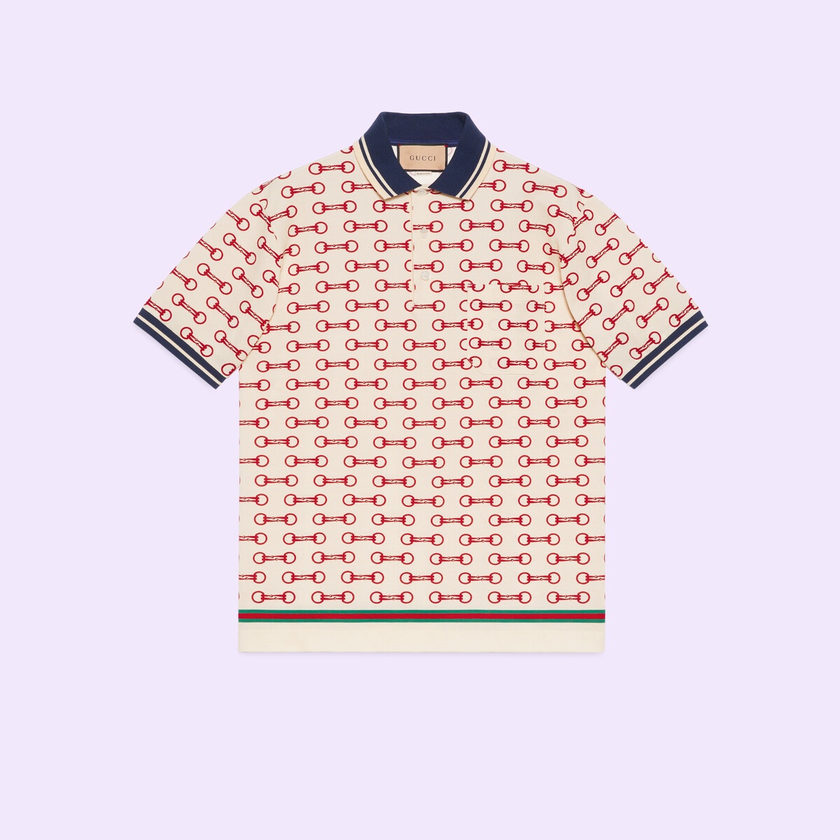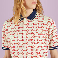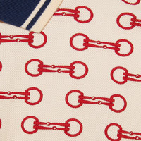 During the Cruise 2023 Gucci Cosmogonie fashion show, new constellations of House codes were presented. The now recognizable Horsebit continues to decorate new iterations of the polo shirt. - Ivory and red Horsebit print stretch cotton piquet - Multicolor trim - Short sleeve - Made in Italy