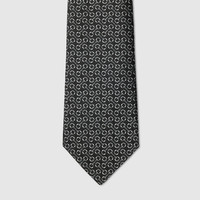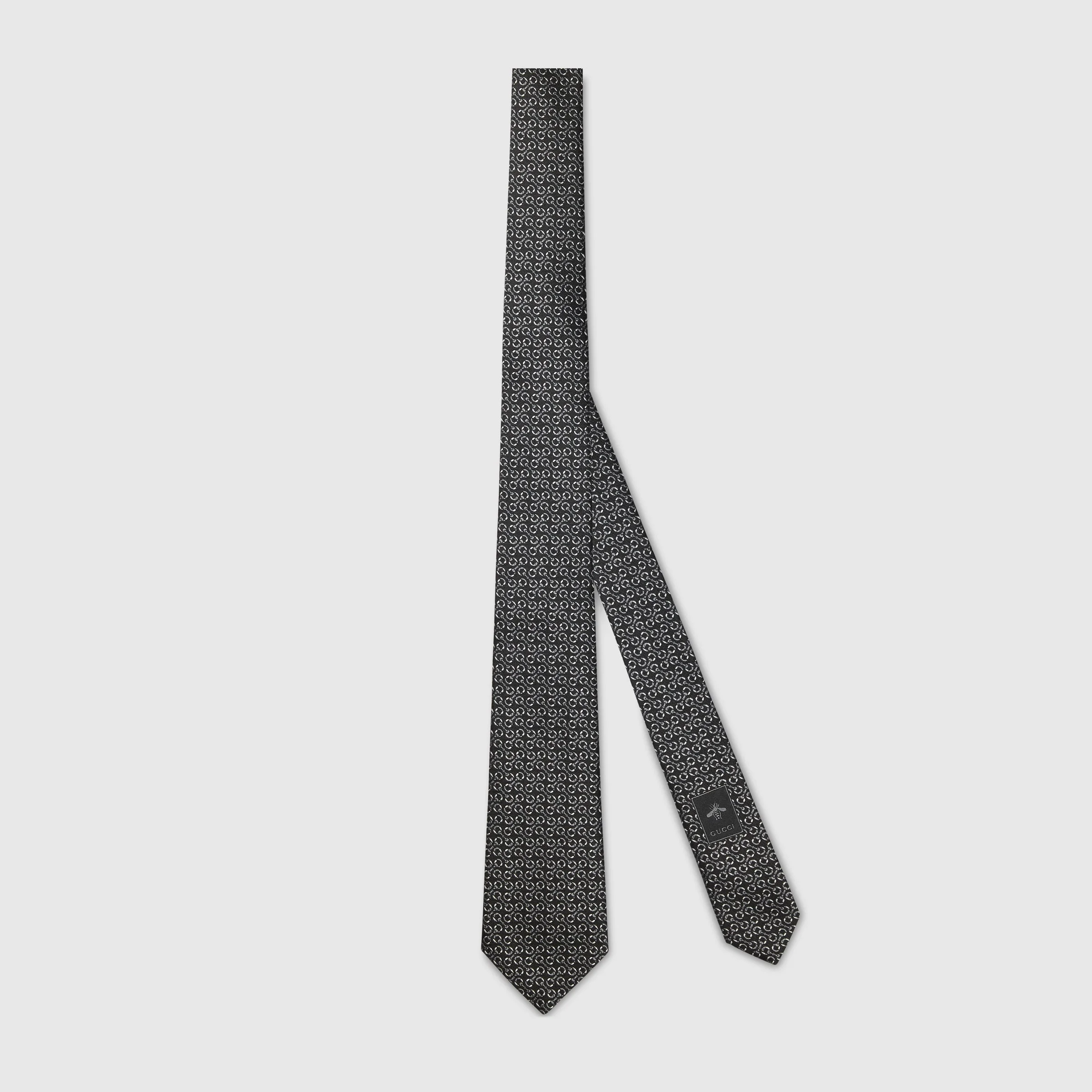 The House's silk accessories collection continues to reinterpret emblematic motifs, from the GG, Web, Flora, bamboo, Horsebit and equestrian inspirations, in sumptuous materials, intricate craftsmanship, and fresh hues. Crafted from two-tone silk, this tie features a Horsebit jacquard. - Black and white Horsebit silk jacquard - Gucci bee label on the back - 2.75"W x 58.2"L - Made in Italy - Main fabric: silk 100%; lining: cupro 60%, silk 40%;