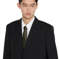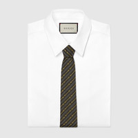 The Pre-Fall 2025 collection explores fresh interpretations of signature symbols and codes of the House. This tie is stated in a Horsebit silk jacquard, highlighting Gucci's rich equestrian heritage. - Black and grey Horsebit silk jacquard - Gucci bee label on the back - 2.75”W x 57.5”L - Made in Italy