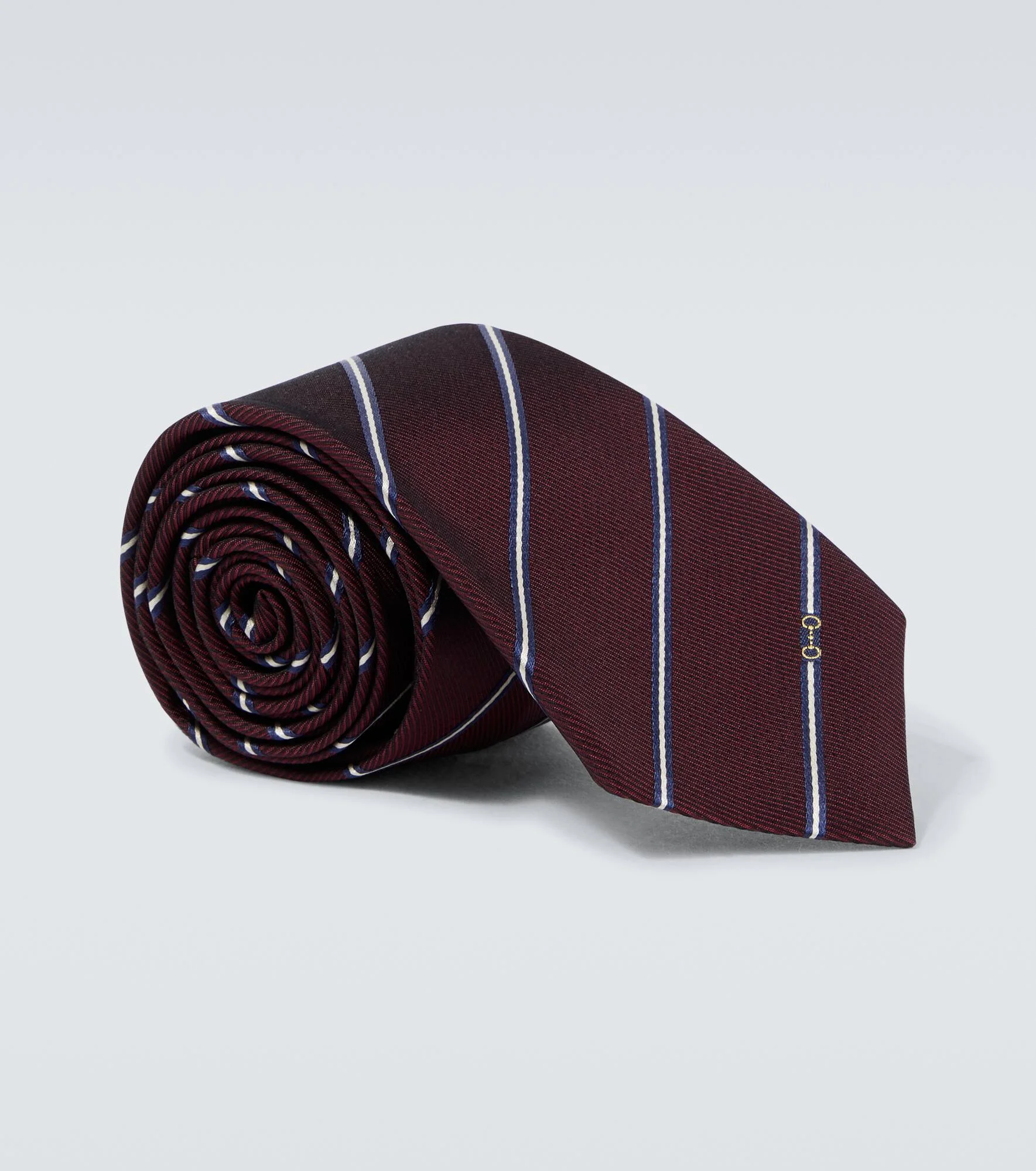 For all your formal events, rely on Gucci's refined accessories, like this tie. Made from pure silk, the design is detailed with stripes and the house's Horsebit jacquard motif. Product Details - Material: 100% silk - Care instructions: dry clean - Made in Italy - Designer color name: Bordeaux/Blue - Item color: burgundy, blue - Item number: P01124267 Size & Fit - Max. width 7cm-3"