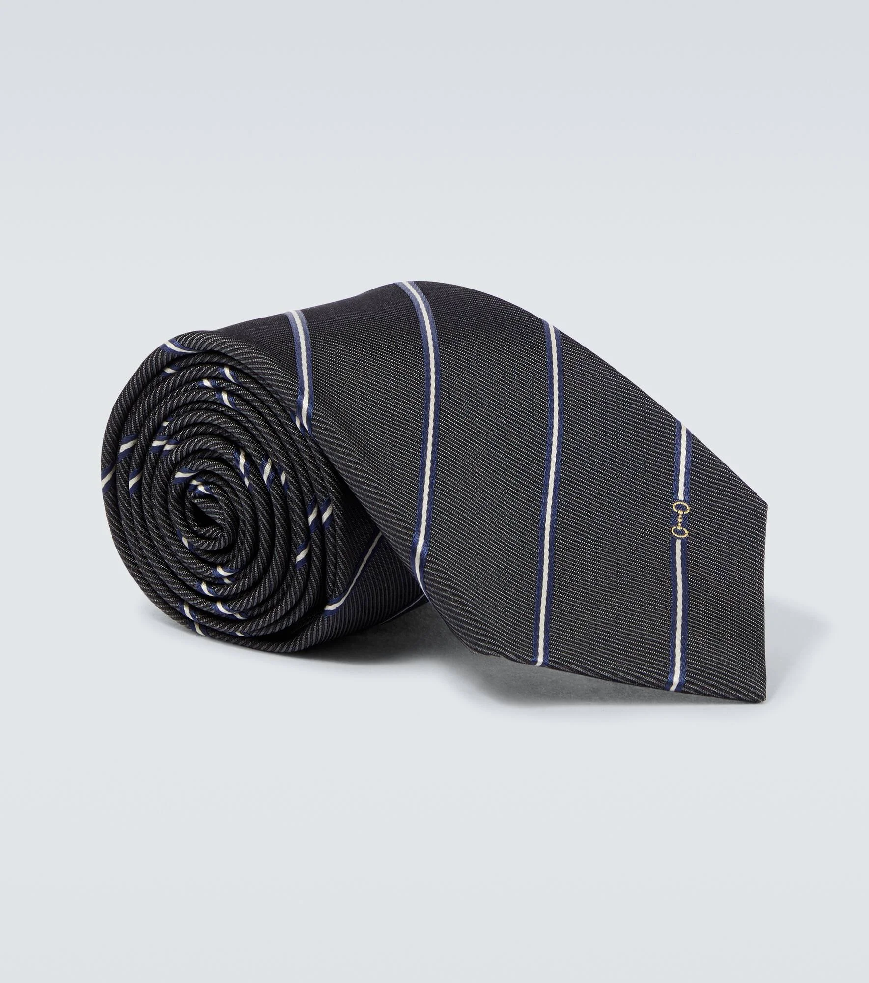 For all your formal events, rely on Gucci's refined accessories, like this tie. Made from pure silk, the design is detailed with stripes and the house's Horsebit jacquard motif. Product Details - Material: 100% silk - Care instructions: dry clean - Made in Italy - Designer color name: Anthracite/Blue - Item color: gray - Item number: P01124265 Size & Fit - Max. width 7cm-3"