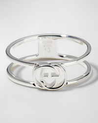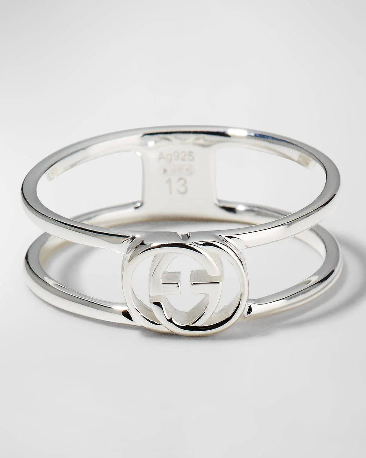 Gucci interlocking G ring. 925 sterling silver. Keep jewelry away from water and chemicals; remove during physical activities; store separately in a soft pouch. To care for this piece keep jewelry away from water and chemicals; remove during physical activities; clean and polish it with a soft cloth and store it separately. Approx. 0.2"W