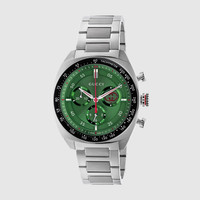 Powered by a quartz movement with a chronograph function, the new Gucci Interlocking watch combines the historic codes of the House with a contemporary feel. The style in 41mm case offers a green dial with a black ceramic bezel and tachymeter indication. Finished with a stainless steel bracelet, the accessory is enriched with the signature Interlocking G logo in a small seconds display. - 41mm stainless steel case, green dial, Interlocking G small seconds display, black ceramic bezel with tachymeter indication, stainless steel bracelet - Sapphire glass with antireflective coating - The warranty certificates for Gucci watches purchased after March 1st 2022 are exclusively available online. - Download your certificate at - by using the serial number engraved on the back of your watch. - 10 ATM (100 meters/330 feet) - Quartz movement with chronograph function - Wrist size from 5.9" to 8.4" - YA142318 - Swiss Made
