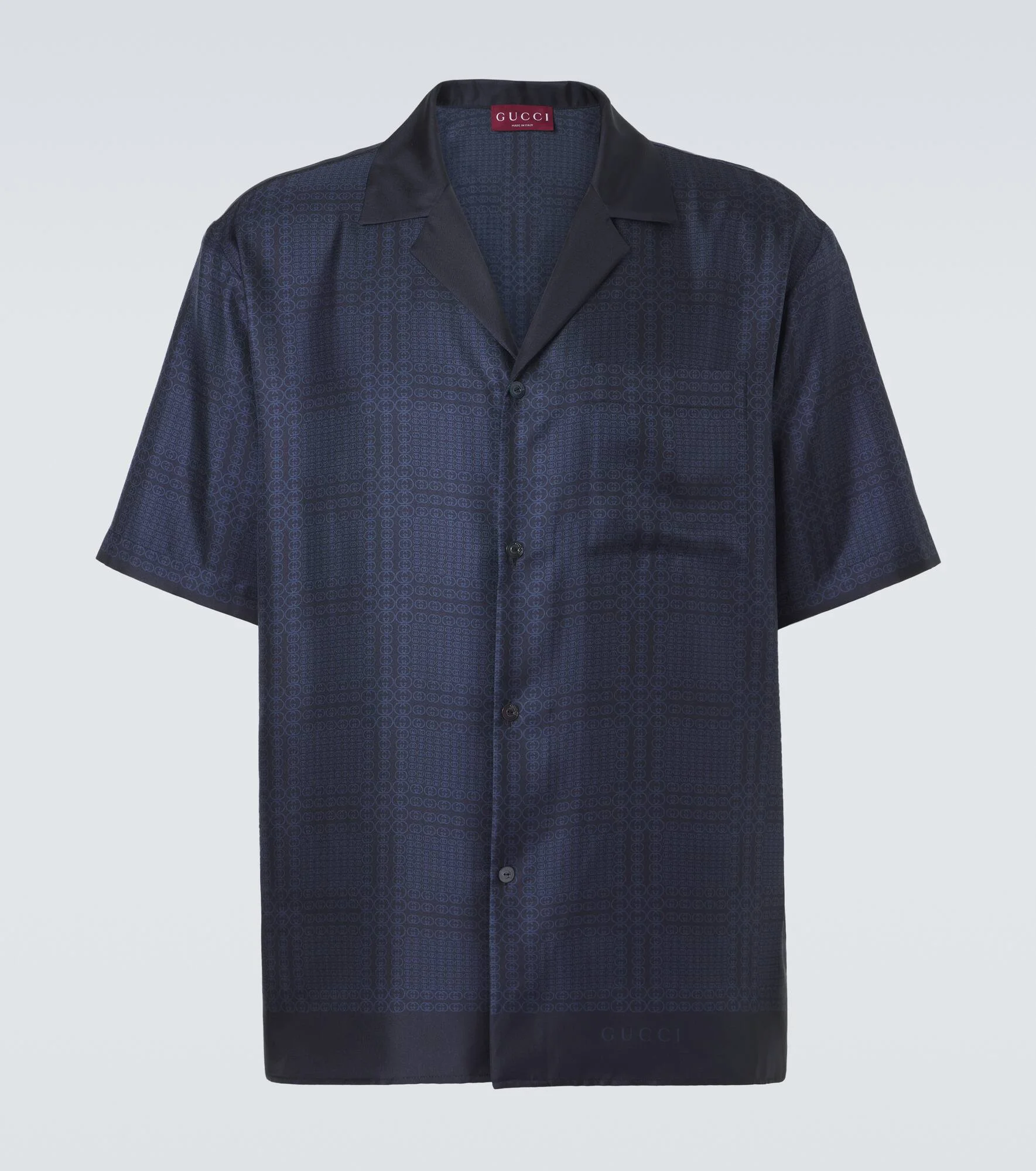 An unwavering commitment to craftsmanship and heritage sets Gucci apart. Made from lustrous silk twill, this fluid bowling shirt is printed all over with the house's Interlocking G motif. Product Details - Material: 100% silk - Care instructions: dry clean - Made in Italy - Color: blue - Designer color name: Dark Blue / Blue / Mc - Collar: Cuban - Pockets: angled chest pocket - Closure: buttoned front - Contains non-textile parts of animal origin - Item number: P01124235 Size & Fit - True to size - Without pleats in the back - Designed for a loose fit - Non-stretchy fabric - Falls below the hip - Height of model is 189cm-74.5" and wears a size IT 50