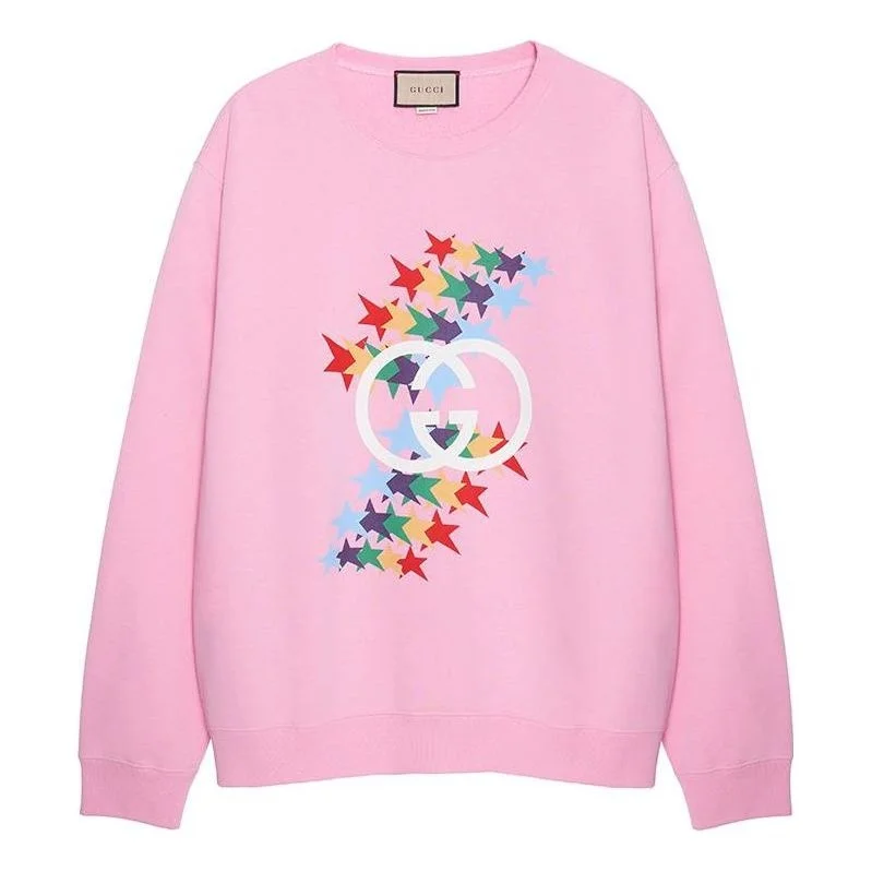 Inspired by the night sky, a spattering of rainbow-colored stars defines reimagined designs throughout the Ouverture collection. This light pink cotton jersey sweatshirt has an Interlocking G star flash print. - Pink light felted cotton jersey with Interlocking G star flash print - Crewneck - Long sleeves - Ribbed hem and cuffs - Made in Italy