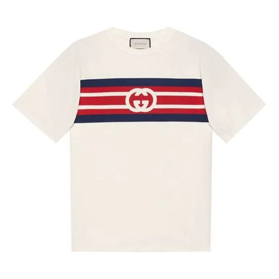 Men's Gucci SS21 Interlock Double G Stripe Printing Short Sleeve Creamy White T-Shirt 616036-XJDAG-9