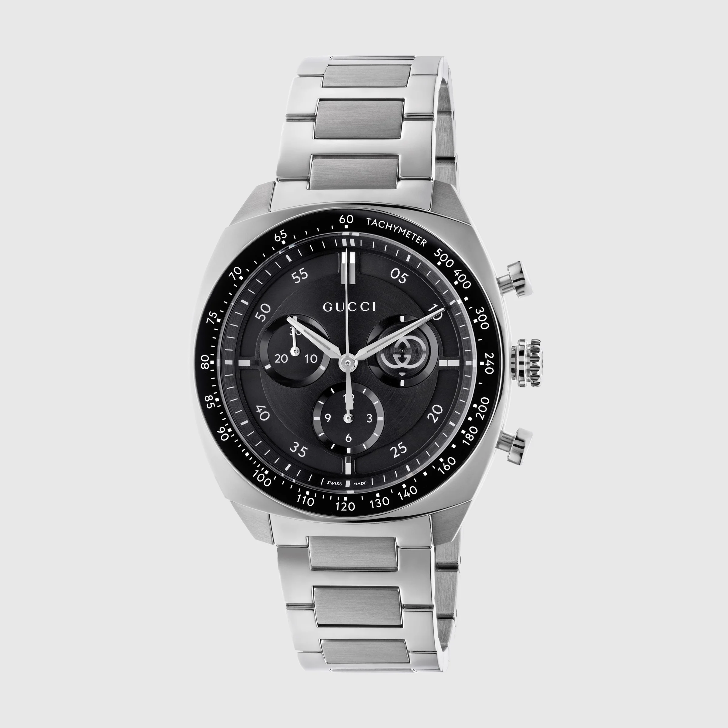 Powered by a quartz movement with a chronograph function, the new Gucci Interlocking watch combines the historic codes of the House with a contemporary feel. The style in 41mm case offers a black dial with a black ceramic bezel and tachymeter indication. Finished with a stainless steel bracelet, the accessory is enriched with the signature Interlocking G logo in a small seconds display. - 41mm stainless steel case, black dial, Interlocking G small seconds display, black ceramic bezel with tachymeter indication, stainless steel bracelet - Sapphire glass with antireflective coating - The warranty certificates for Gucci watches purchased after March 1st 2022 are exclusively available online. - Download your certificate at - by using the serial number engraved on the back of your watch. - 10 ATM (100 meters/330 feet) - Quartz movement with chronograph function - Wrist size from 5.9" to 8.4" - YA142316 - Swiss Made