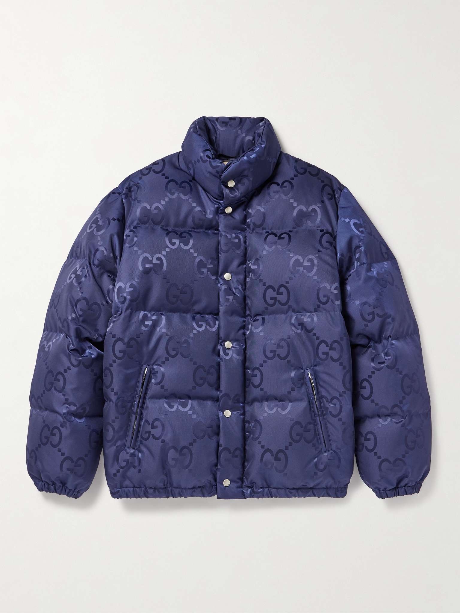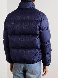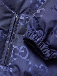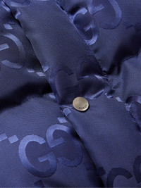 Gucci’s ‘GG’ monogram needs no introduction – it's been a house signature since the 1970s. This quilted jacket is made from navy shell jacquard-woven with a ‘Jumbo’ version of the motif in glossy threads. The thick down filling is exceptionally insulating too, so you can stay warm while looking stylish. Size & Fit - Fits true to size. Take your normal size - Designed for a regular fit - Padded, non-stretchy fabric - Model is shown wearing an IT 46 - Model measures: chest 36"/ 92cm, height 6'3"/ 191cm Details & Care - Navy shell - Snap fastenings - 100% polyamide; filling: 90% down (Goose), 10% feathers (Duck); lining: 100% cotton - Dry clean