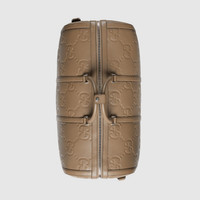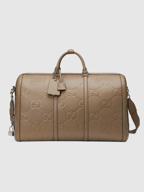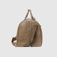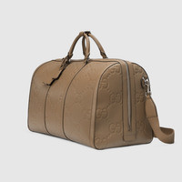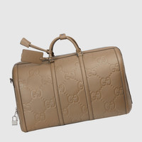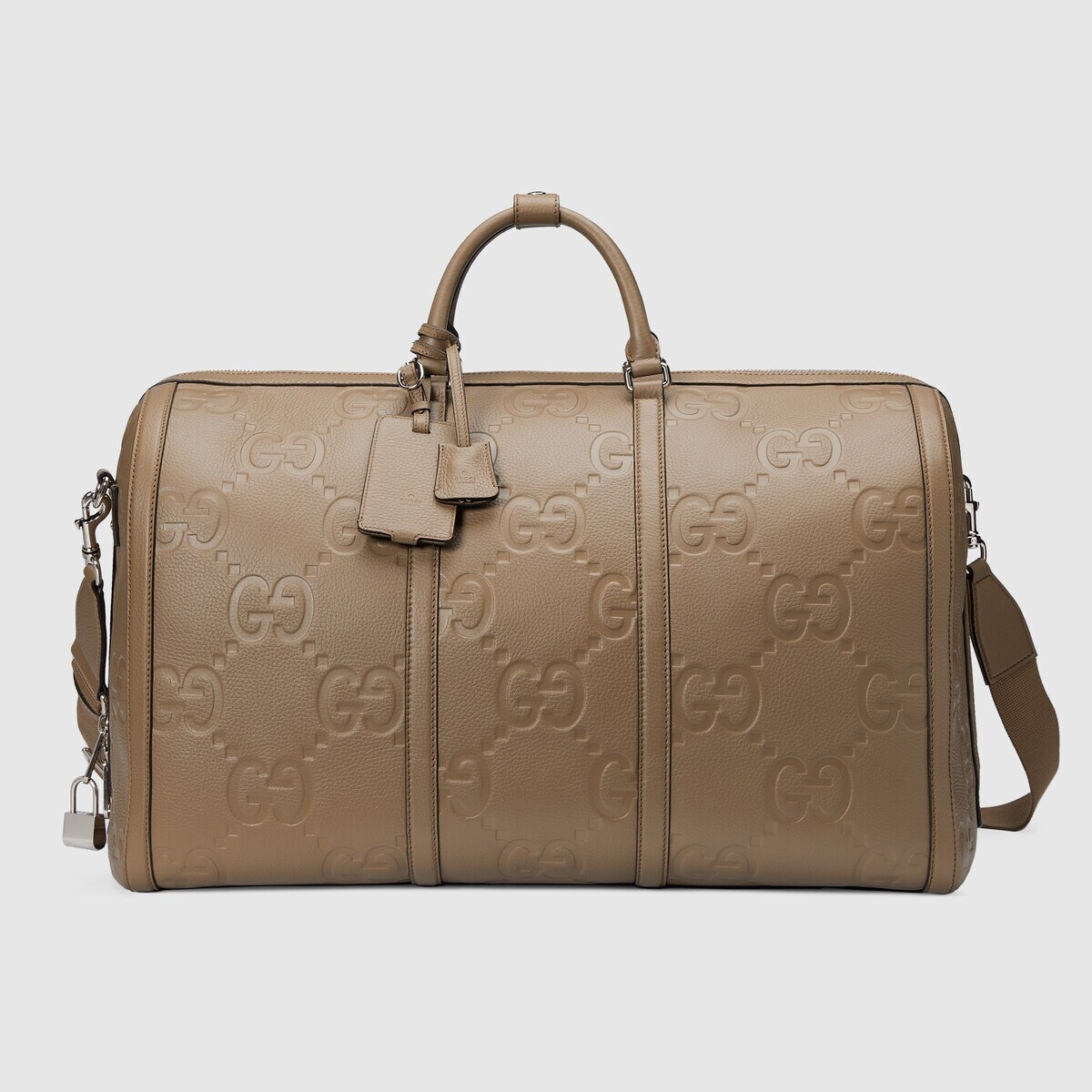 Gucci transcribes its heritage, creativity, and innovation into a plenitude of collections. From staple items to distinctive accessories, from the everyday wardrobe to special occasions, the House's beloved motifs embellish the latest leathergoods. Here a large duffle bag appears in jumbo GG taupe leather as part of the new luggage line. - Taupe jumbo GG leather - Taupe leather trim - Cotton linen lining - Detachable identification tag, key holder and lock - Inside: 2 zip pockets - Top handle with 3.9" drop - Adjustable canvas shoulder strap with 19.7" drop - Zip closure - Weight: 7.5lbs approximately - 20.5"W x 13.4"H x 11.4"D - Made in Italy