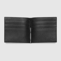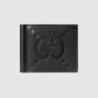 The all-black jumbo GG design returns for Pre-Fall 2023 atop a selection of small leather pieces. A reinterpretation of Guccio Gucci's initials, the motif is an evergreen of the House that appears prominently in maxi size for an eye-catching logo feel. Here the emblematic leather defines this money clip with six card slots. - Black jumbo GG leather - Moiré lining - Inside: 6 card slots, interior money clip - Closed: 4.3"W x 3.5"H x 0.4"D - Open: 7.7"W x 3.5"H - Made in Italy - Weight: 0.12lbs approximately