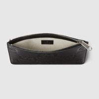 The historic monogram transforms small everyday accessories into contemporary companions. New textures and finishes continue to feature prominently throughout Gucci's latest collections, offering dynamic and unique offerings. This pouch appears in black grainy leather with a maxi version of the logo appearing allover. - Black jumbo GG leather - Zip closure - Weight: 0.34lbs approximately - 9.2"W x 7"H - Made in Italy