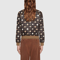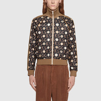 The Epilogue collection takes shape in silhouettes inspired by the ‘70s, featuring oversized botanical prints and rainbow stripes sourced from Ken Scott’s archive. Nicknamed the ‘Fashion Gardener,’ Ken Scott is an American designer who lived in Milan in the ‘60s and ‘70s and whose colorful floral drawings reflect his eclectic personality. The artist's initials combine with the GG logo in the print decorating this cotton jersey zip-up jacket. - Ivory and beige Ken Scott x Gucci monogram print black cotton jersey—Ken Scott is brand of Mantero - Beige and brown stripe down the sleeves - Contrast piping - Interlocking G patch on one sleeve - Rib knit trims - Front pockets - Zip front - 55% Polyester 45% Cotton - Made in Italy - The product shown in the image is a size small