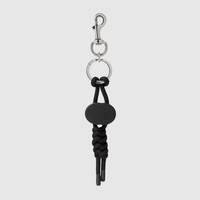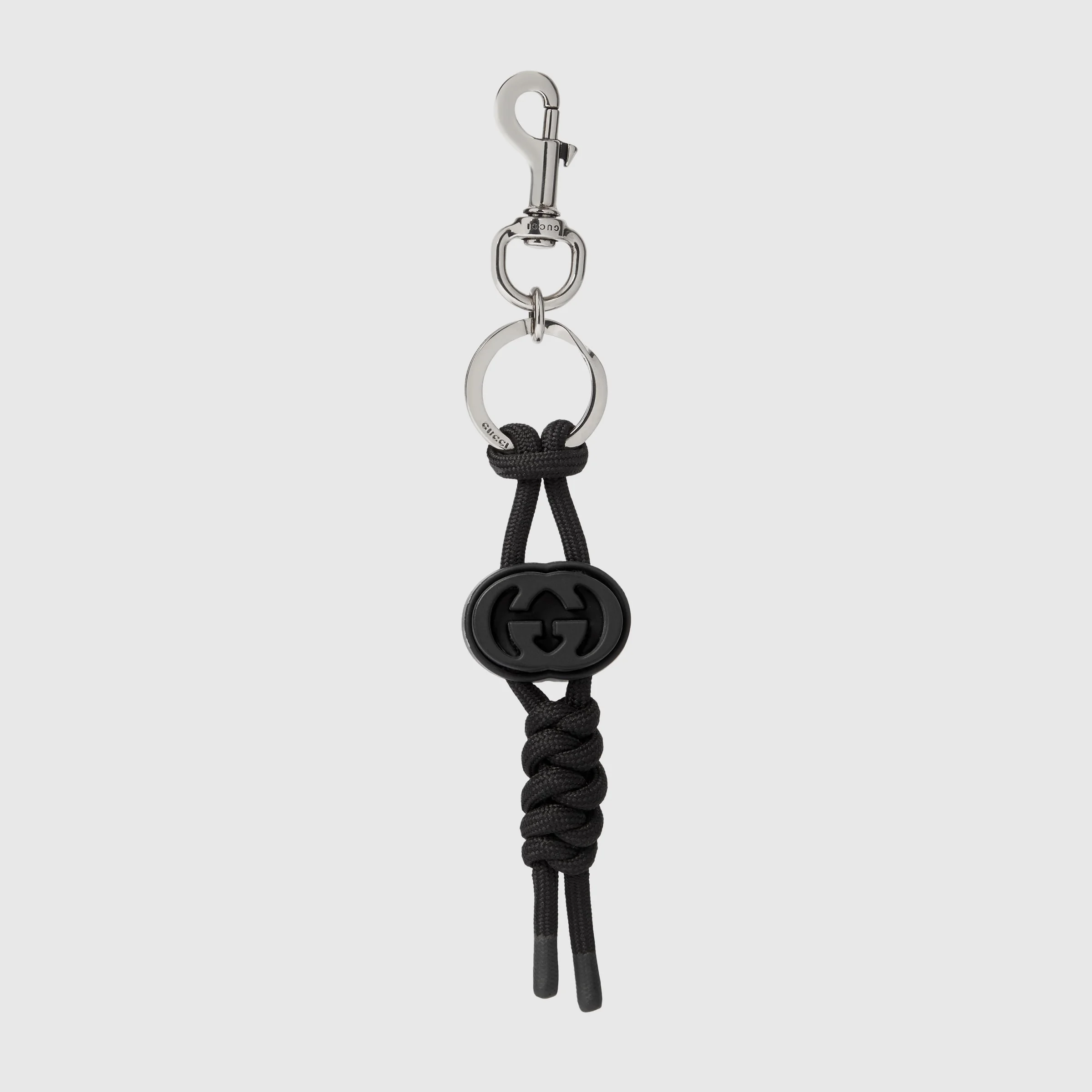 The Pre-Fall 2025 collection introduces accessories that speak to the House's signature themes. This keychain features an Interlocking G motif atop a knotted rope base. - Black knotted rope - Palladium-toned hardware - Interlocking G - Key ring and hook fastening - 1.5"W x 8.2"H x 0.7"D - Weight: 0.09lb, approximately - Made in Italy