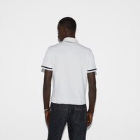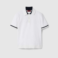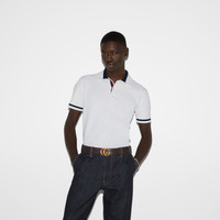 The Pre-Fall selections spotlight essential silhouettes with emblematic details from daywear to eveningwear. This straight-cut polo shirt is made from a piquet knit cotton and reveals a contrasting Gucci intarsia along the button line. - White piquet knit cotton - Black trim - Gucci intarsia - Polo collar - Short sleeves - Rib trim - Button closure - Length: 25.5", based on a size small - Made in Italy - The product shown in the image is a size small