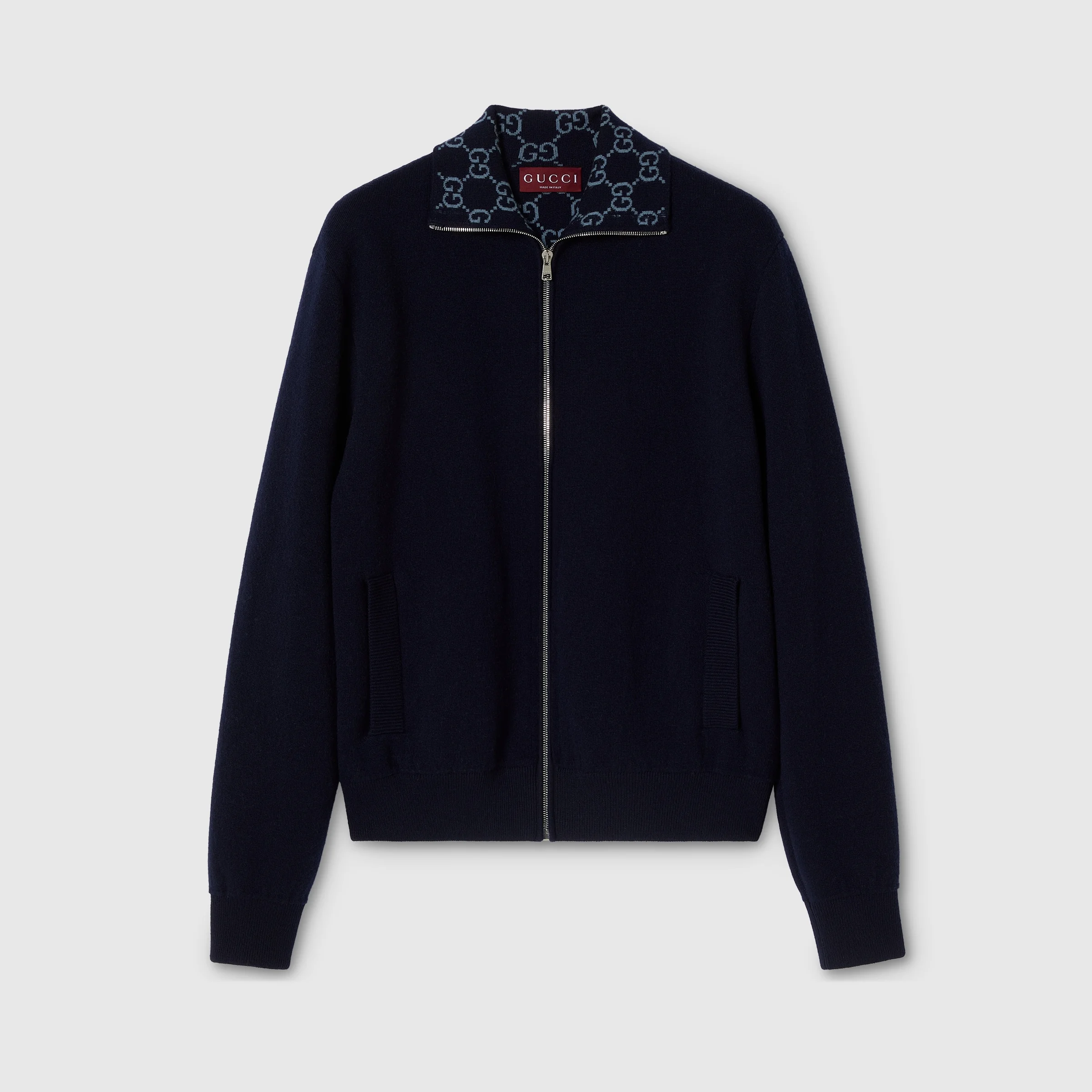 The distinctive GG is translated across different textile techniques in the collection, offering visual richness. Crafted from blue knit double wool, this zip jacket features the GG motif inside. - Blue knit double wool with GG inside - Stand up collar - Front pockets - Rib trim - Long sleeves - Front zip closure - Length: 26.7"; based on a size M