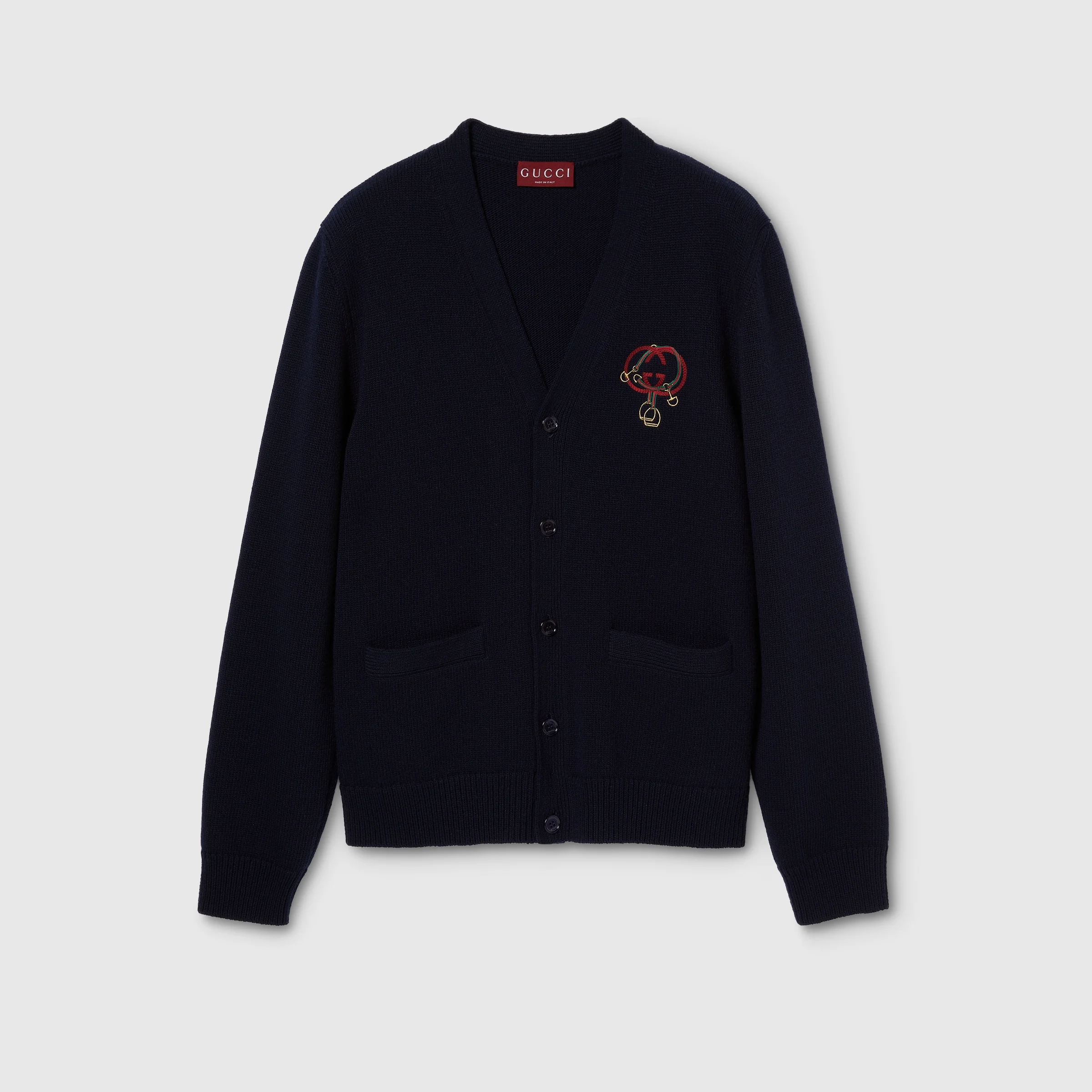 Equestrain symbols embellish signature silhouettes with a vibrant touch. Crafted from dark blue knit wool, this cardigan is enriched with a Web Interlocking G and stirrup embroidery. - Dark blue knit wool - Web Interlocking G and stirrup embroidery - V neck - Front pockets - Rib trim - Long sleeves - Front button closure - Length: 26.5" based on a size S - Fabric: 100% Wool - Trimming: 97% Wool, 2% Polyamide, 1% Elastane - Embroidery: 94% Polyester, 6% Viscose
