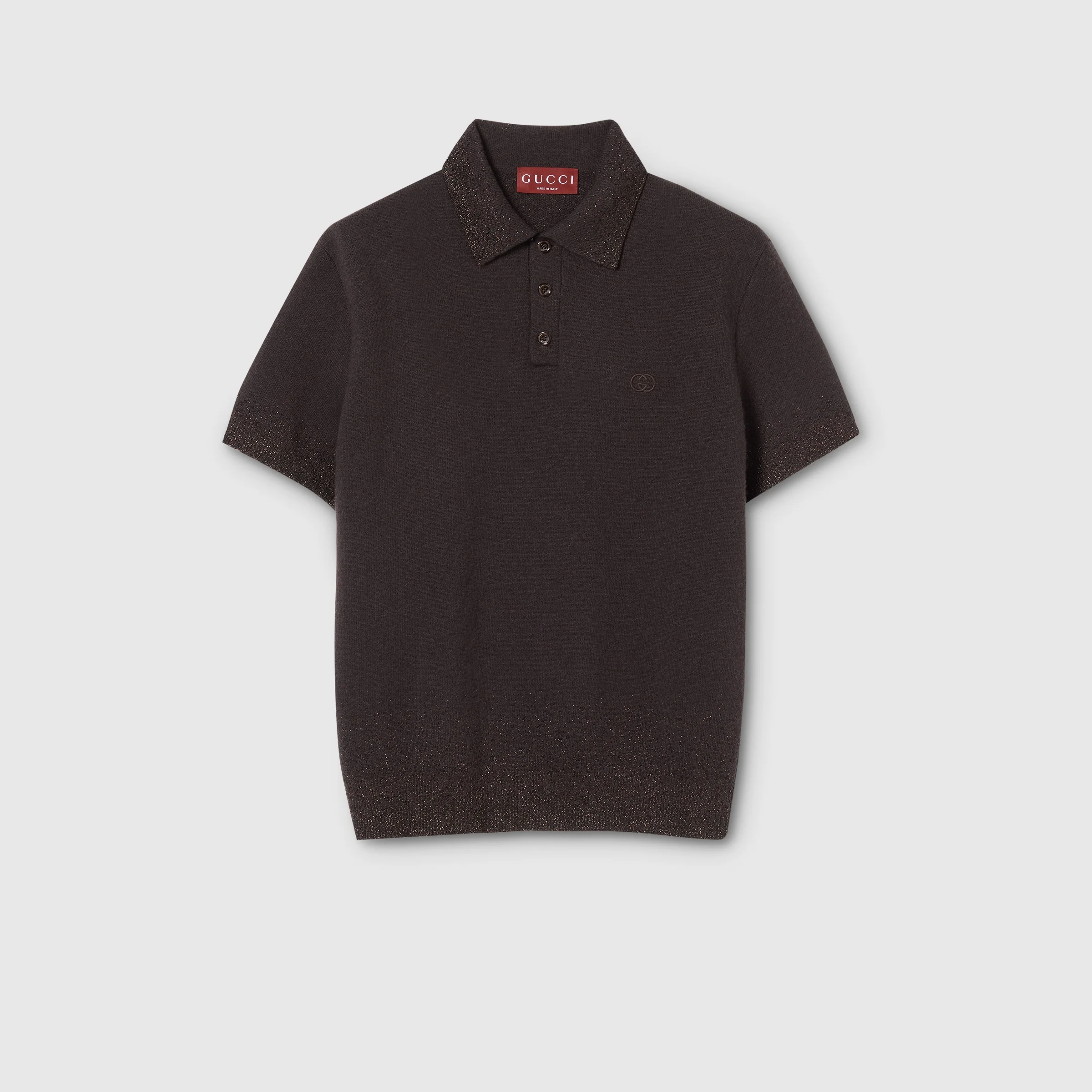 Silhouettes, fabrics, and craftsmanship draw from the House codes and speaks to the present without losing sight of the heritage. Crafted from dark brown knit wool lurex, this polo shirt is enriched with an Interlocking G embroidery. - Dark brown knit wool lurex - Interlocking G embroidery - Polo collar - Short sleeves - Front button closure - Length: 24", based on a size small