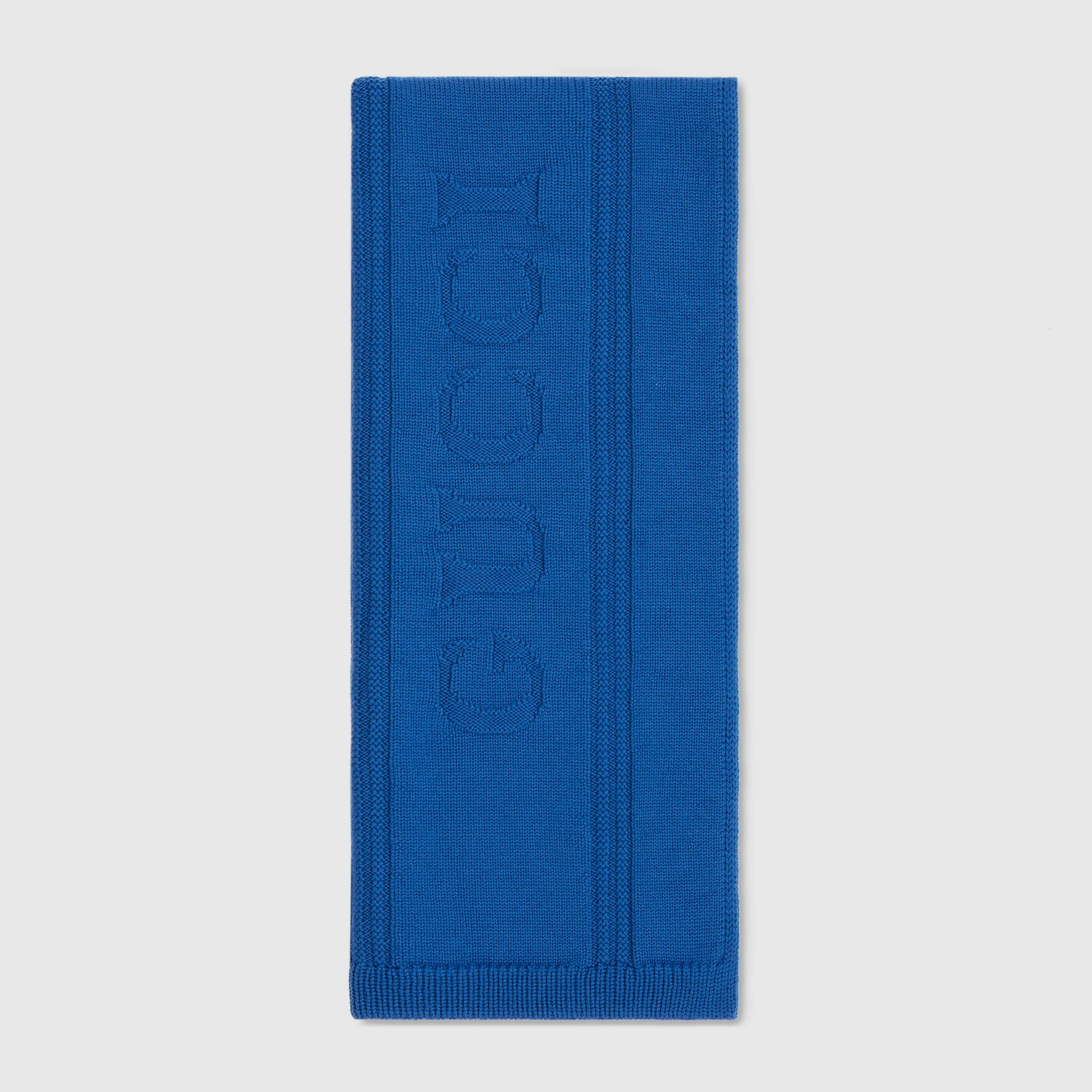 The House's silk accessories collection continues to reinterpret emblematic motifs, from the GG, Web, Flora, bamboo, Horsebit and equestrian inspirations, in sumptuous materials, intricate craftsmanship, and fresh hues. This knit wool scarf features a knit Gucci logo and tonal knit piping down the center. - Blue knit wool - Tonal knit piping - Main material contains 100% NATIVA™ wool from regenerative farming practices - Knit Gucci logo - 9.8"W x 70.9"H - Main fabric: wool 100%