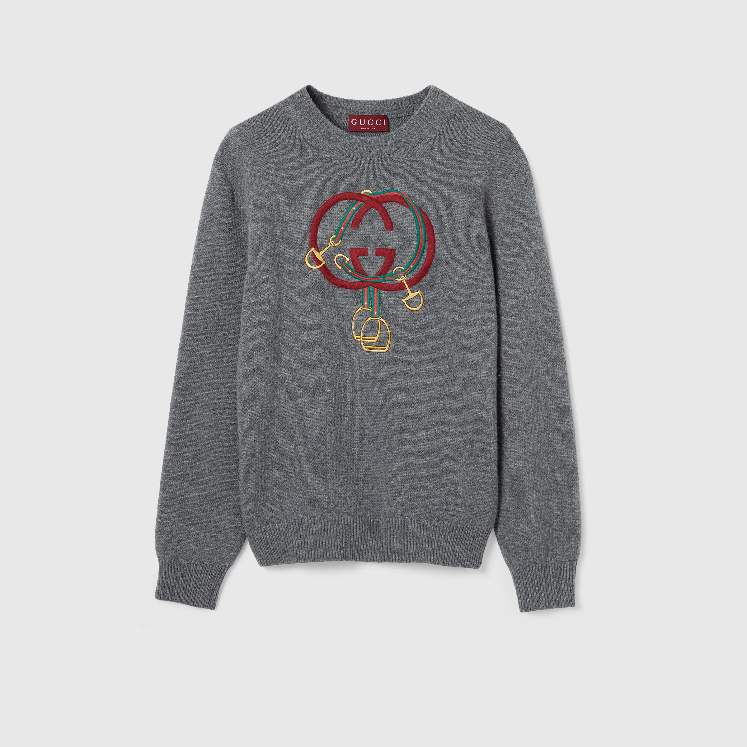 Equestrain symbols embellish signature silhouettes with a vibrant touch. Crafted from dark grey knit wool, this sweater is enriched with a Web Interlocking G and stirrup embroidery. - Dark grey knit wool - Web Interlocking G and stirrup embroidery - Crewneck - Long sleeves - Rib trim - Length: 25.9" based on a size S - Fabric: 100% Wool - Trimming: 95% Wool, 4% Polyamide, 1% Elastane - Embroidery: 75% Polyester, 9% Acrylic, 9% Wool, 5% Viscose, 2% Metallised fiber