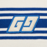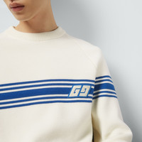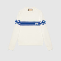 Gucci's new menswear collection reinterprets several key pieces in the essential wardrobe through silhouette, color and texture. Staples such as this knit wool sweater are presented in a new light with a contrasting stripe detail and a Square GG embroidered patch. - Ivory and blue knit wool - Square GG embroidered patch - Stripe detail - Crewneck - Long sleeves - Length: 26", based on a size small - Made in Italy - The product shown in this image is a size small