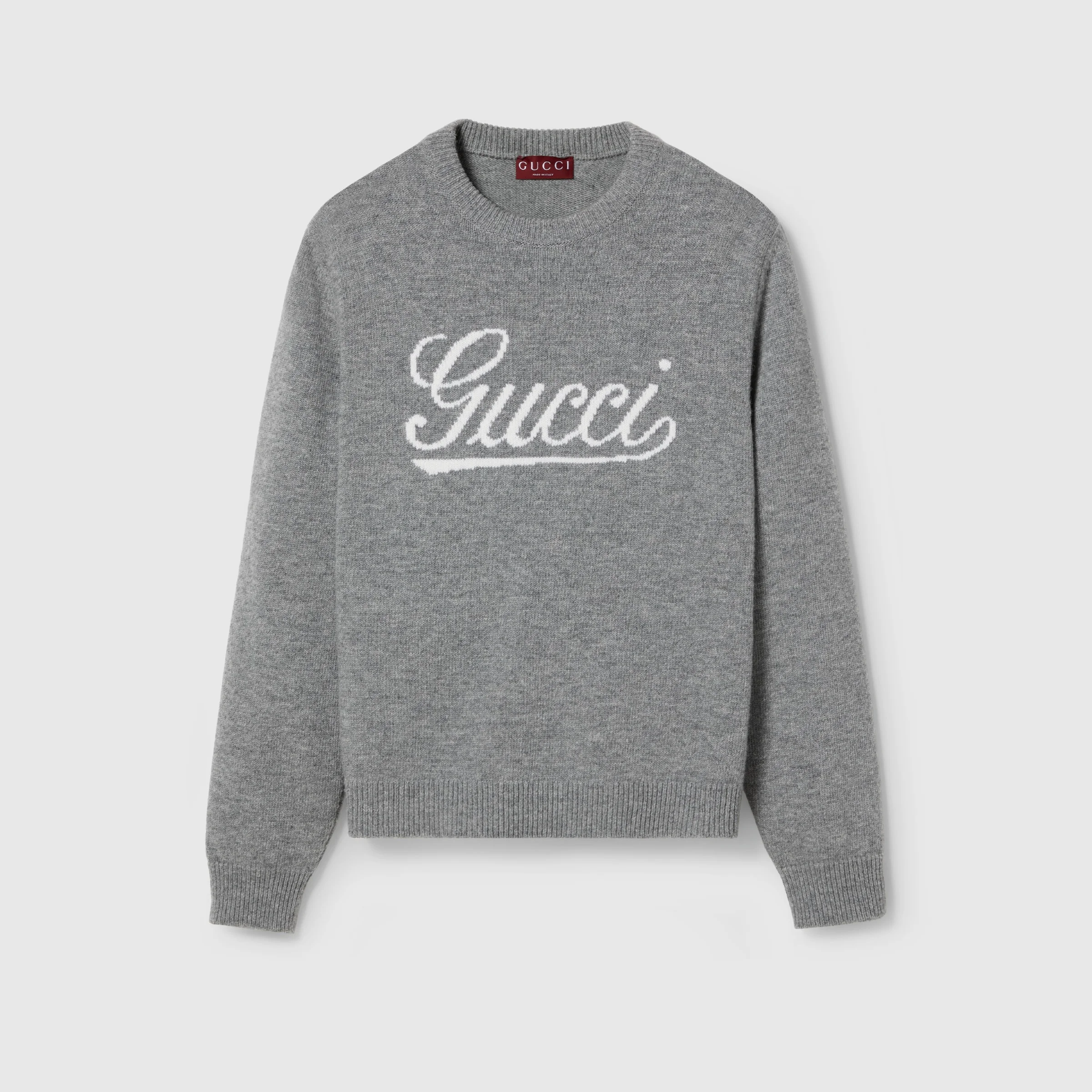Transitioning into the warm season, new sets bring to mind a sartorial uniform enriched with subtle yet refined details, in cotton or jersey, in logo-detailed outerwear or knitwear. Crafted from grey wool, this regular fit sweater is defined by a contrasting Gucci script intarsia. - Grey wool - Gucci script intarsia - Crewneck - Dropped shoulder - Rib trim - Shoulder drop: 16.5"; based on a size S - Chest: 19.8"; based on a size S - Sleeves length: 25.5"; based on a size S - Regular fit - Length: 25.3"; based on a size S - Made in Italy - The product shown in this image is a size small