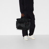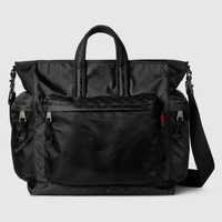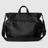 Part of the Cruise 2025 collection, the men's bag selection blends sleek lines with a sporty attitude. This tote bag in soft yet resistant black nylon provides a sophisticated backdrop for the allover GG motif. Other signature details include a green and red Web detail. - Black GG nylon - Nylon lining - Web detail - Inside: 1 zip pocket - Outside: 1 front zip pocket, 1 back zip pocket and 2 side zip pockets - Top handle drop: 3.5" - Adjustable canvas shoulder strap with 21.6" drop; Length: 29.5"-52" - Large: 15"W x 15.7"H x 9"D - Weight: 2.5lbs approximately - Made in Italy