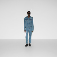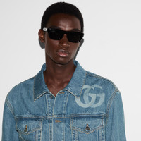 The Cruise 2025 collection introduces a fresh take on denim, with subtle details that elevate everyday looks. This relaxed denim jacket has been cut from a washed certified cotton denim and reveals a lasered Double G logo and Gucci jacron label. - Blue washed certified cotton denim - Lasered Double G logo - Unlined - Point collar - Dropped shoulder - Long sleeves - Two chest pockets - Two side pockets - Gucci jacron label - Button closure - Length: 25.5"; based on a size 54 (IT) - Made in Italy - The product shown in this image is a size 54 (IT)
