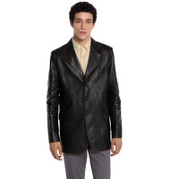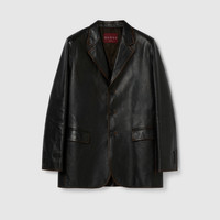 In the Fall Winter 2025 collection, essential and sharp lines define the silhouette through refined fabrics and classic British tailoring elements. This single-breasted jacket is enriched by aged-effect detailing and a Gucci logo embossed on the left pocket. - Black and brown soft aged-effect leather - Embossed Gucci logo on the left flap pocket - Horn buttons - Fully lined - Single-breasted - Two front flap pockets - Button closure - Regular fit - Total length: 32.2"; Shoulder: 18.3"; Chest: 21.2"; Sleeve length: 26.6"; (size 48 IT)
