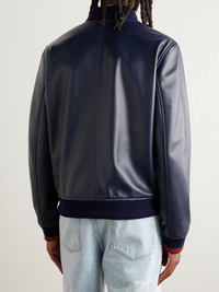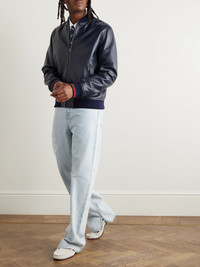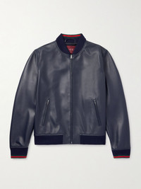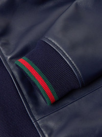 Gucci's bomber jacket is trimmed with green and red ribbed-knit stripes along the cuffs, a subtle reference to the label's signature heritage webbing. It's been made in Italy from supple leather and is lined in satin-twill for easy layering. Size & Fit - Fits true to size. Take your normal size - Those who are above 6'1"/ 185cm may wish to take the next size up - Designed for a regular fit - Ribbed hem - Supple, non-stretchy leather - Model is shown wearing an IT 48 - Model measures: chest 38"/ 96cm, height 6'0"/ 183cm Details & Care - Navy leather, navy, red and green ribbed-knit - Zip fastening - 100% leather (Lamb) - Dry clean