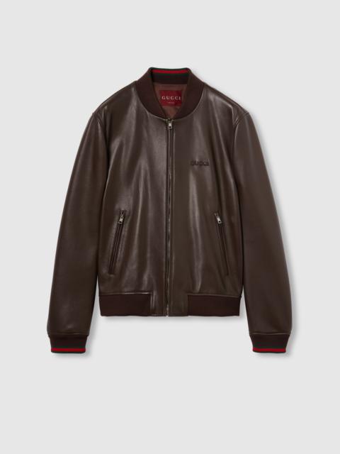 This piece is part of the Pre-Fall 2024 collection, presenting a modern take on sophisticated materials, essential silhouettes, and emblematic details. This bomber jacket with a regular fit is crafted from smooth black leather, featuring a subtle Gucci embroidery on the chest, green and red Web detail inside the knitted collar and on the knitted cuffs. - Black soft leather - Gucci embroidery - Green and red Web - Black lining - Knitted collar - Two front zip pockets - Rib trim - Inside pocket - Zip closure - Cut for a regular fit - Length: 26"; Shoulder: 18.7"; Chest: 22.8"; Sleeves length: 27"; based on a size 48 IT - Made in Italy - The model is 6' and is wearing size 46 (IT) - Genuine leather: Lambskin - Parts in knitted fabric: 95% Wool, 4% Polyamide, 1% Elastane - Lining: 100% Viscose - Embroidery: 100% Polyester