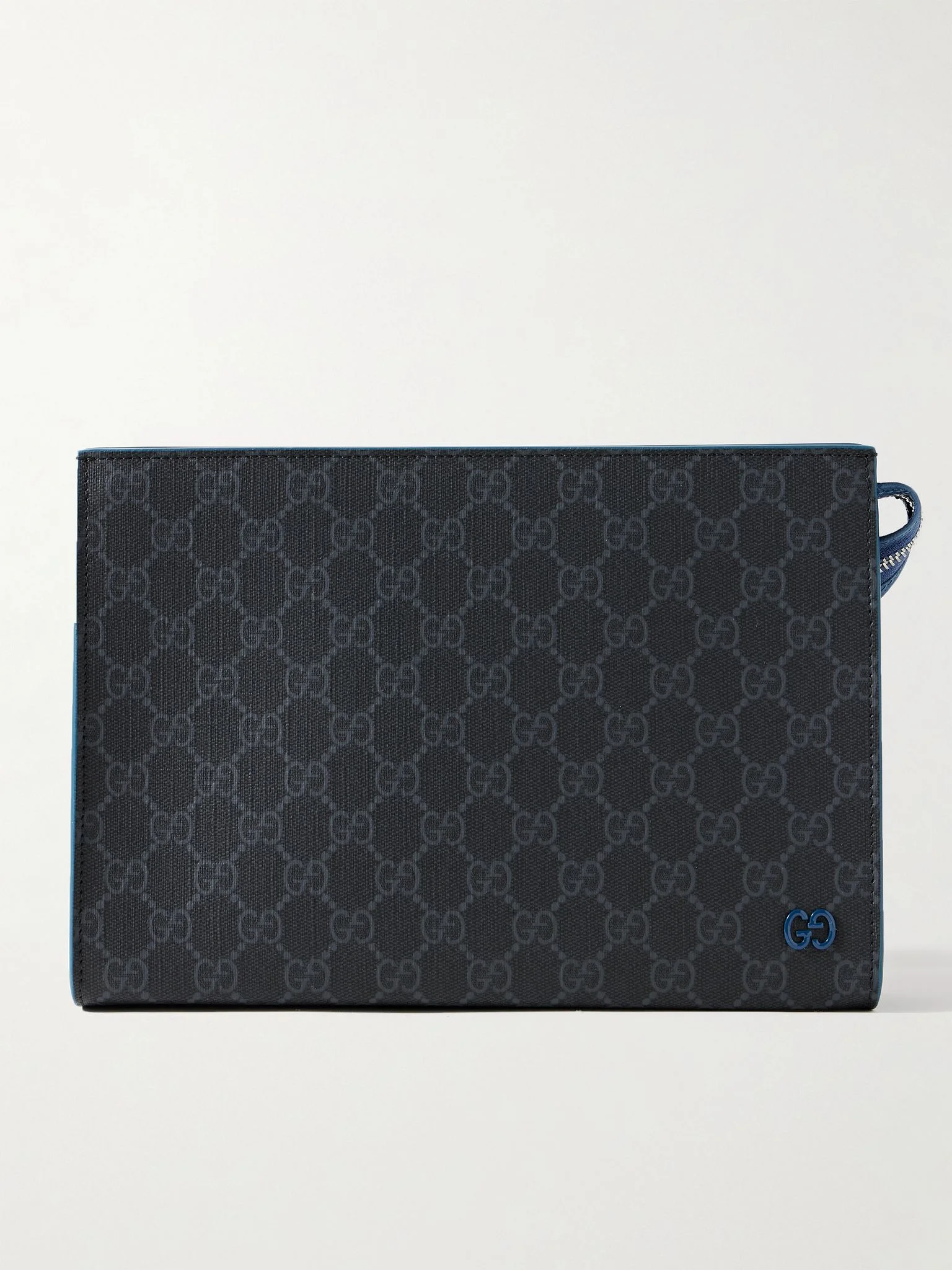 Gucci's Italian-made pouch is crafted from signature coated-canvas, which is printed with an allover 'GG' monogram. It's trimmed with leather and opens to a slim interior with six card slots and enough space to hold your phone and keys. Details & Care - Black and anthracite coated-canvas, blue textured-leather (Calf) - Removable strap - Internal card slots - Leather lining - Zip fastening - Comes with dust bag