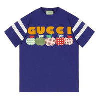 An emblem of the Gucci's playful spirit, fruits and vegetables have become contemporary House codes that animate the latest collections. Speaking to this theme, this T-shirt is defined by a whimsical apple motif. - Blue heavy cotton jersey with Gucci apple print - Contrast stripes at the sleeve - Crewneck - Made in Italy
