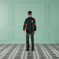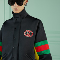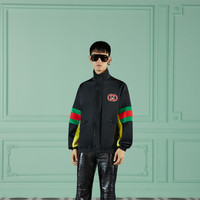 Gucci rewrites the rules of on-the-go fashion. Activewear-inspired pieces animate the collection through a series of retro style fits with House codes. This light neoprane jacket has the green and red Web around the sleeves and is finished with the Interlocking G patch. - Black light neoprane with yellow contrast detail under the arms - Green and red Web detail around arms - Interlocking G patch - Black polyester net lining - Snap button closure - Front zip pockets - Made in Italy