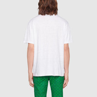 A recurring detail of this collection, the Double G label adds a subtle logo connotation to this V-neck T-shirt, crafted from white linen jersey. A message about leaving fashion’s old rules behind, the Epilogue collection conveys the idea that pieces should be timeless–not just in fashion for one season. - White linen jersey - Front Double G label - V-neck - Short sleeves - Made in Italy - The product shown in this image is a size medium