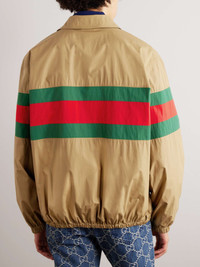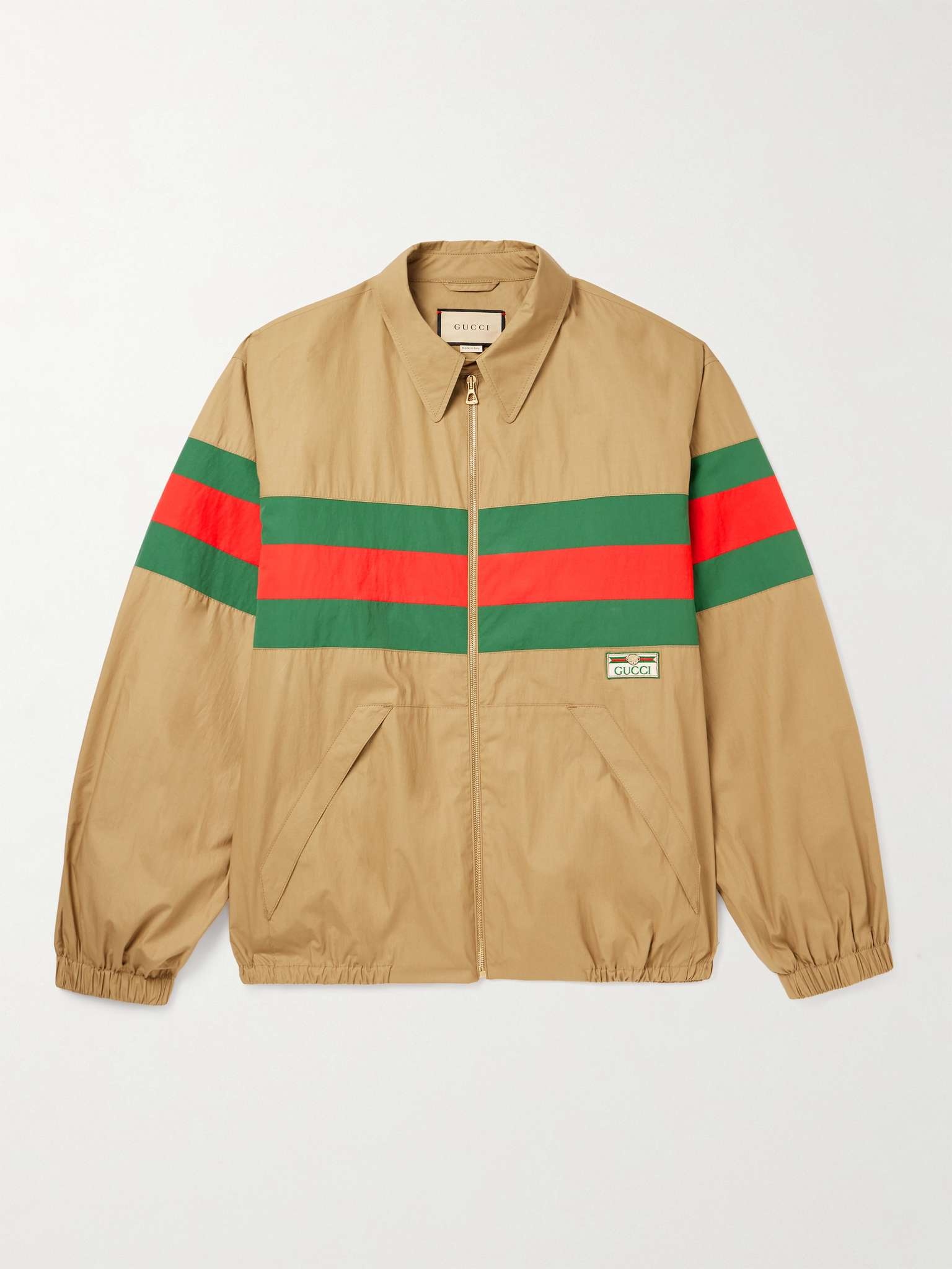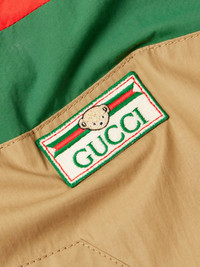 Gucci's jacket takes its cues from classic sportswear. Made from lightweight cotton, it's cut for a comfortable fit and trimmed with shell stripes mirroring its classic webbing. The appliquéd logo is headed by a teddy bear mascot. Size & Fit - Fits true to size. Take your normal size - Designed for a boxy fit - Dropped shoulder seam - Elasticated at the hem - Lightweight, non-stretchy fabric - Model is shown wearing an IT 48 - Model measures: chest 38"/ 96cm, height 6'2"/ 188cm Details & Care - Brown cotton, green and red shell - Zip fastening - 100% cotton; trim: 100% polyamide - Dry clean