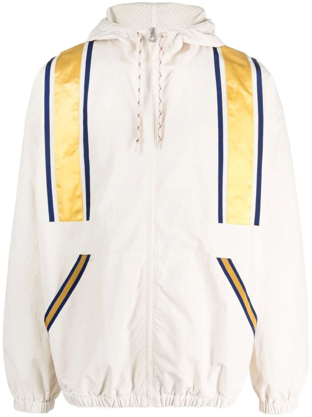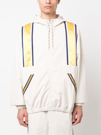 logo-embroidered hooded jacket Highlights - Light beige/lemon yellow/navy blue - Cotton blend - Stripe detailing - Embroidered logo to the rear - High neck - Drawstring hood - Front zip fastening - Two diagonal pockets to the sides - Long sleeves - Elasticated cuffs - Drawstring hem Made in Italy Composition Outer: Polyamide 100%, Cotton 70%, Viscose 30% Lining: Polyester 100% SIZE & FIT Model measurements Height 6 ft 1 in(1.85 m) Bust/Chest 35.82 in(91 cm) Hips 37.79 in(96 cm) Waist 29.13 in(74 cm) FittingInformation Designed to be unstructured, offering a loose fit throughout The elasticated hem allows for movement and a comfortable fit Made from a lightweight non-stretch fabric This piece fits true to size – take your usual size