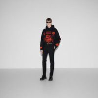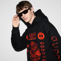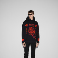 Emblematic codes of the House and refined patterns are reinterpreted in contemporary ways for the Pre-Fall collection. This oversize fit heavy felted cotton jersey hooded sweatshirt features signature Gucci symbols combined with flora and fauna elements. - Black heavy felted cotton jersey - Gucci symbols with flora and fauna print and embroidery - Fixed hood with drawstring - Drop shoulder - Rib trim - Shoulder drop: 24.8"; based on a size M - Chest: 25.9"; based on a size M - Sleeves length: 24.4"; based on a size M - Oversize fit - Length: 28.3"; based on a size M - The product shown in this image is a size medium