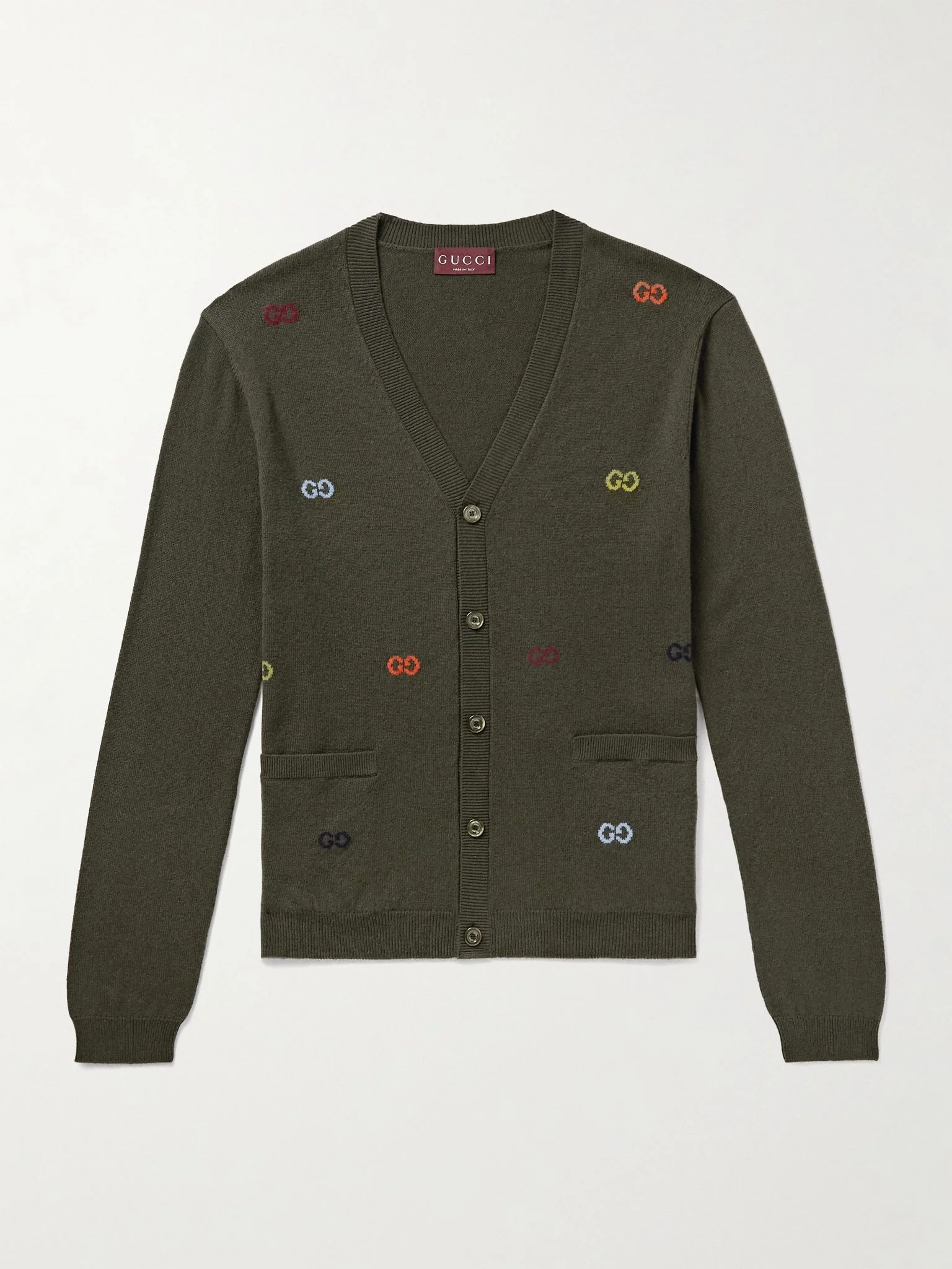 Gucci's cardigan is jacquard-knitted with colourful 'GG' motifs that stand out against the forest-green backdrop. It's been made in Italy from lightweight cashmere and fastens with lustrous mother-of-pearl buttons. Size & Fit - Fits true to size. Take your normal size - Designed for a regular fit - Slightly long in the sleeves - Lightweight knit - Model is shown wearing a S - Model measures: chest 36"/ 92cm, height 6'2"/ 188cm Details & Care - Multicoloured cashmere - Button fastenings - 100% cashmere - Dry clean - Mother-of-pearl: Australia