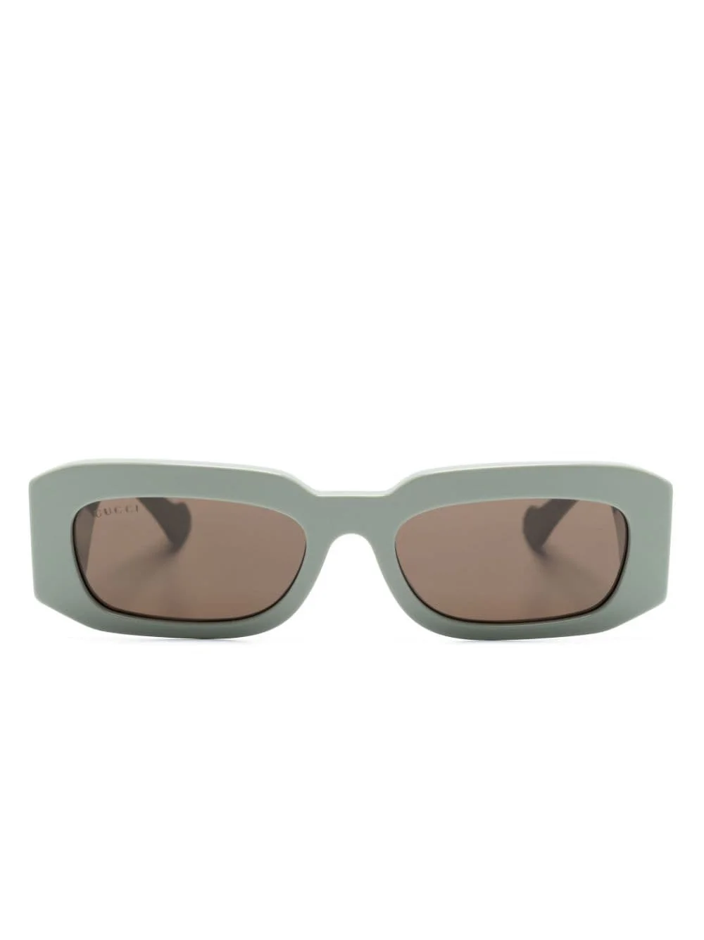 logo-lettering rectangle-frame sunglasses Highlights - Sage green - Acetate - High-shine finish - Rectangle frame - Brown tinted lenses - Uv-protective lenses - Gold-tone logo lettering - Oversize arms - Curved tips - These glasses come with a protective case. Made in Italy Composition Acetate 100% SIZE & FIT Measurement Arm Length 5.7 in(14.5 cm) Bridge Width 0.74 in(1.9 cm) Lens Diameter 2.12 in(5.4 cm) Total Width 5.51 in(14 cm)