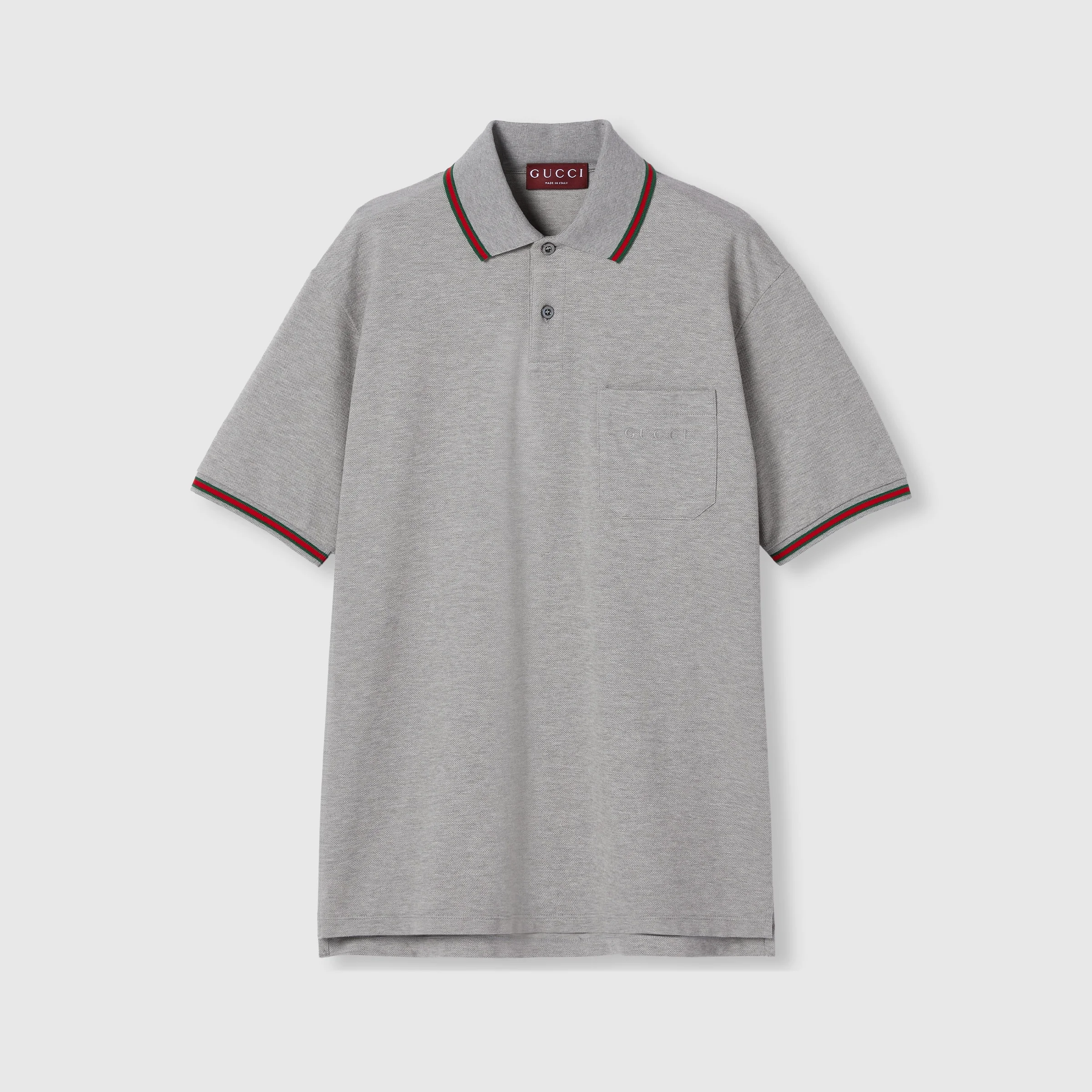 Fall shades define a selection of ready-to-wear pieces paired with heritage details of the House. This regular fit polo shirt is presented in grey melange stretch cotton piquet and is defined by a logo embroidery. - Grey melange stretch cotton piquet - Web stripe trim - Gucci embroidery - Polo collar - Dropped shoulder - Short sleeves - Chest pocket - Rib trim - Button closure - Regular fit - Length: 29.5"; Shoulder: 18.7"; Chest: 22.4"; Sleeves length: 9.4"; based on a size M - Made in Italy