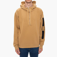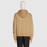 The Gucci vintage logo is refashioned with a minimalistic approach and an unexpected, vertical placement. The '80s inspired print contrasts a washed camel background on this cotton jersey hooded sweatshirt. - Camel heavy felted organic cotton jersey - Black Gucci vintage logo print on the sleeve - This product contains organic cotton where the cultivation and manufacturing process restrict the use of chemicals, eliminate pesticides or artificial fertilizers and incorporate methods that respect biodiversity, improve soil quality, and reduce water consumption. - Fixed hood with drawstring - Top zip detail - 100% organic cotton - Made in Italy - The product shown in this image is a size medium