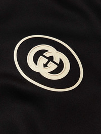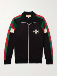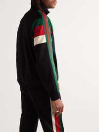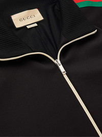 Gucci's bomber jacket channels retro athletic gear with bold stripes along the arms in the brand's signature red and green. Made from jersey, it has a ribbed collar and matching trims and is printed with a sleek designer emblem at the chest. Wear yours with the matching track pants. Size & Fit - Fits true to size. Take your normal size - This jacket is designed for a regular cut - Mid-weight, slightly stretchy fabric - Model wears a M - Model measures: chest 36"/ 92cm, height 6'1"/ 185cm Details & Care - Black jersey - Zip fastening - 90% polyester, 10% elastane; trim1: 91% polyester, 6% polyamide, 3% elastane; trim2: 55% polyester, 45% cotton; trim3: 100% polyamide - Hand wash