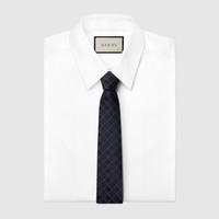Emblematic codes of the House and refined patterns are reinterpreted in contemporary ways for the Pre-Fall collection. This tie is made from a Gucci logo silk jacquard and features a Gucci bee label on the reverse. - Navy and blue geometric Gucci logo silk jacquard - Gucci bee label on the back - 2.75"W x 58.2"L